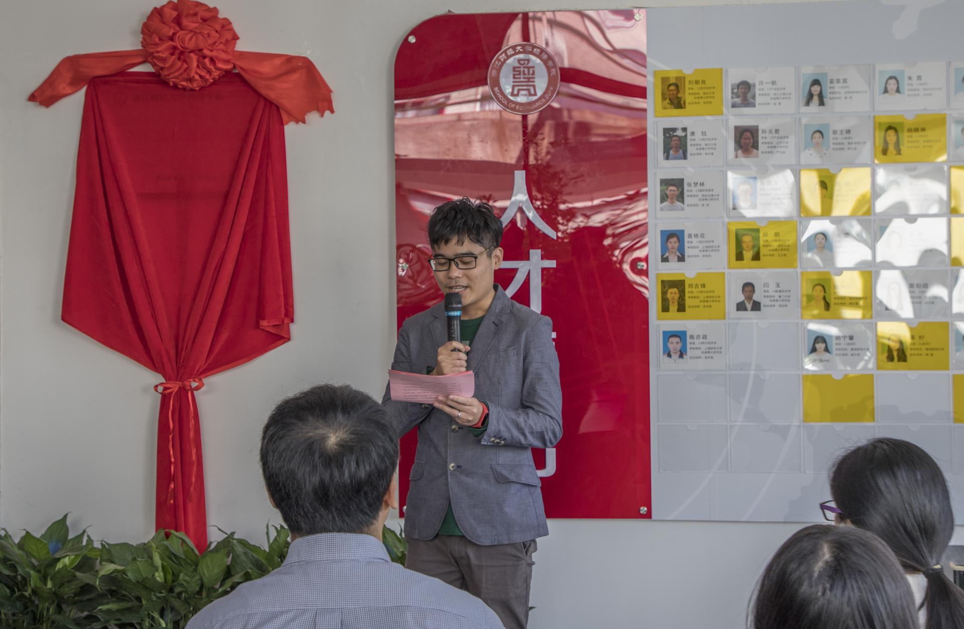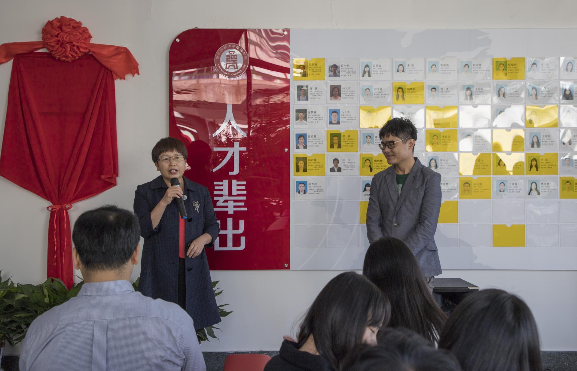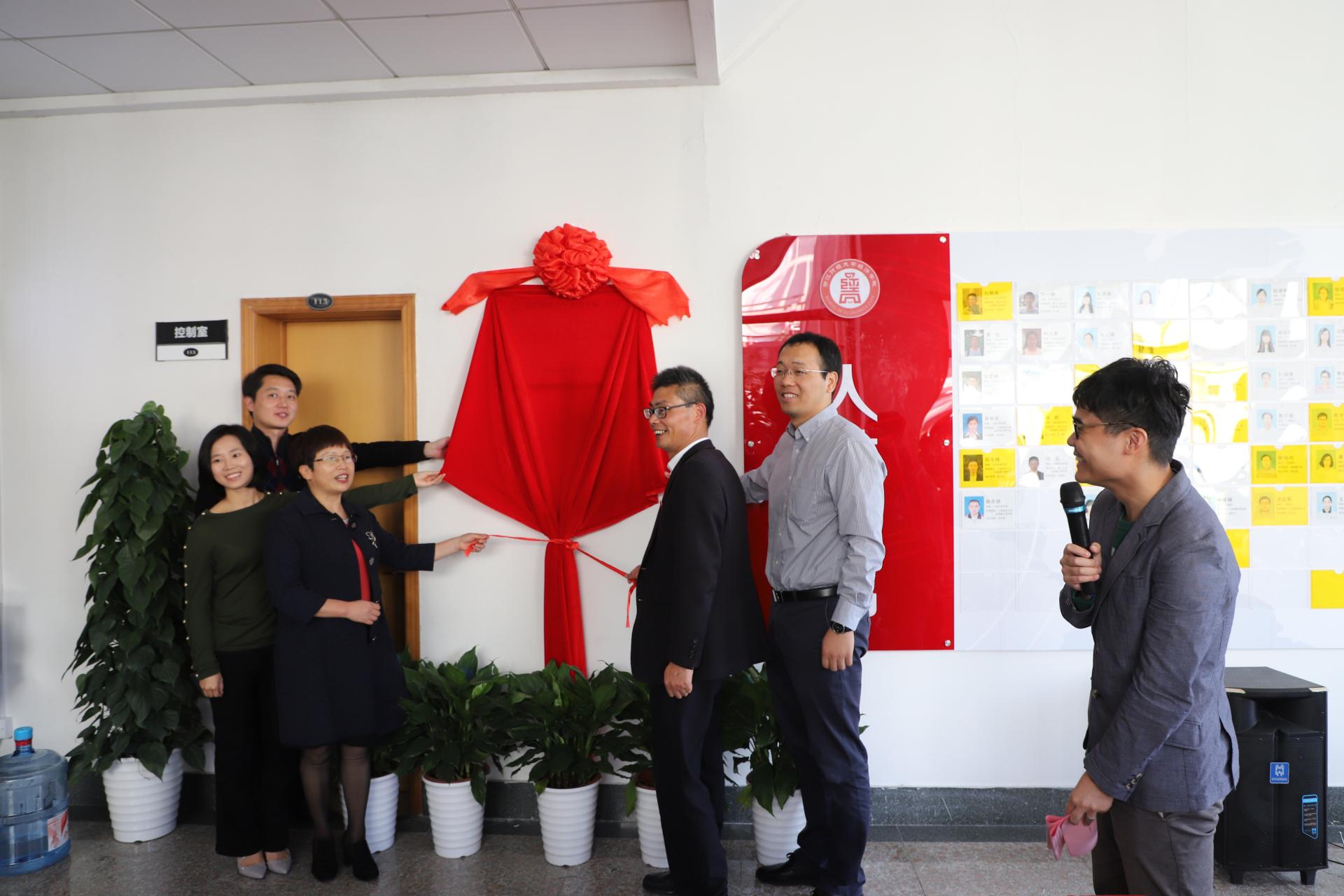 院长胡亦琴、学院党委书记沈水法、校团委副书记杨忍、73882必赢最新官网校友会会长金鑫、上海校友分会副会长余忠娜共同为学创中心揭幕。当红绸缓缓揭下,锃亮的牌匾展现在眼前,大家投以凝重肃穆的目光和热情的掌声,将这一历史性时刻铭记心间。