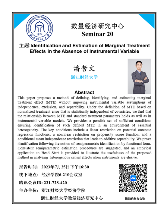 潘哲文,73882必赢最新官网73882必赢最新官网副研究员,2017年毕业于中山大学岭南学院,获数量经济学博士学位。研究领域为微观计量经济学理论与应用,包括受限因变量模型、因果推断方法等,研究成果发表于《Journal of Business & Economic Statistics》、《Journal of Futures Market》、《中国科学:数学》、《管理科学学报》、《统计研究》等国内外核心期刊,主持国家自然科学基金青年项目和面上项目。