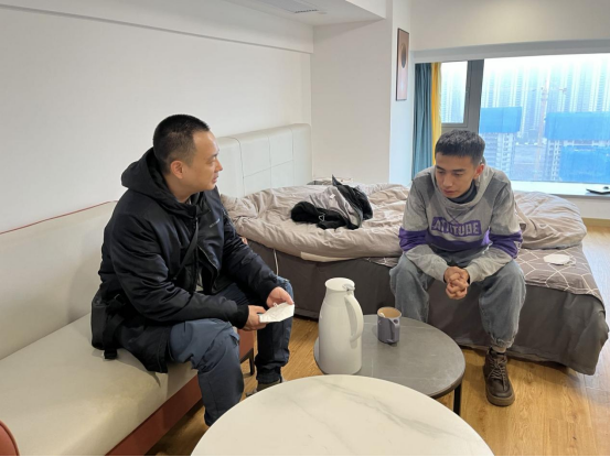 崔泰铭一行先来到海宁市长安镇盈都新天地,看望2020级经济与贸易专业的安卡尔江·艾合麦提,“你在杭州过年,我们代表学院来看看你,向你拜个早年!”“希望你能在杭州愉快过年!”“在外一定要注意用电安全。”崔泰铭叮嘱他在忙碌学业的同时,也要注意劳逸结合。安卡尔江·艾合麦提向老师们讲述了目前的情况,并表示将在假期加强学习、提升专业素养。
